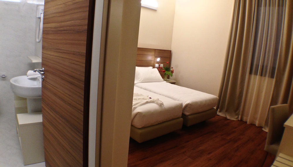 Zweibettzimmer: 2 Einzelbetten, Badezimmer mit Dusche, Fön, Gästeartikel; Minibar, Schreibtisch, Tresor, regulierbare Klimaanlage, Fernseher mit 32" Flachbildschirm, WiFi gratis.